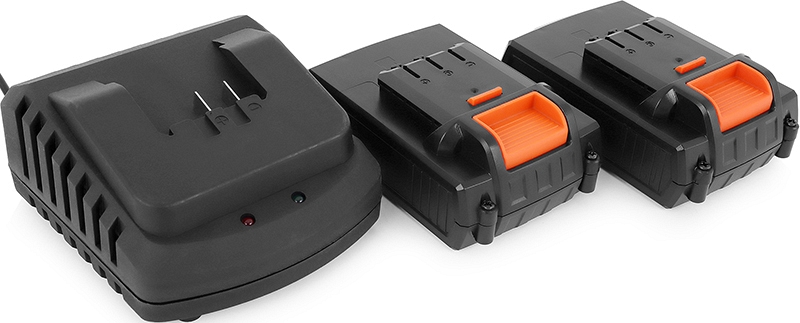 - 2 съемных Li-ion аккумулятора напряжением 18 В, емкостью 2,0 Ач