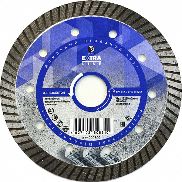 Алмазный отрезной круг Diam Extra Line Turbo Железобетон 125 мм (Диам Экстра Лайн Турбо Железобетон 125 мм) – профессиональный алмазный диск тип Turbo для сухой резки высокоармированного бетона (железобетона), высокопрочного тяжелого мелкозернистого бетона, кирпича, клинкера и других огнеупоров.