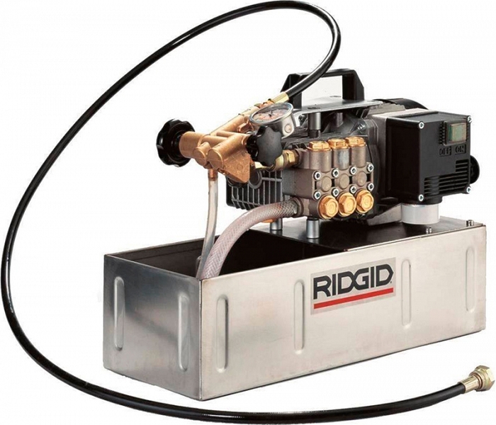Электрический испытательный гидравлический опрессовщик Ridgid 1460-E (Риджид 1460-Е) – опрессовочный насос электрический для испытания под давлением до 25 бар (дополнительно имеется блок управления до 60 бар) широкого спектра гидравлических систем на отсутствие течи, в том числе систем сжатого воздуха и отопления, противопожарных спринклерных систем, холодильных и масляных систем, а также трубопроводных систем небольщого диаметра, в которых применяется масло, вода или смесь этиленгликоля и воды.