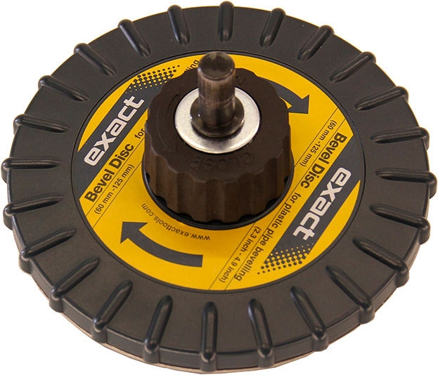 Модель снята с производства! Фаскосниматель для пластиковых труб Exact Bevel Disc (Экзакт Бевел Диск) – регулируемый ручной инструмент для снятия фаски под углом 15° на полиэтиленовых (ПЭ, PE), полипропиленовых (ПП, PP), ПВХ (PVC) и других пластиковых трубах Ø 60 – 125 мм (2,3" – 4,9") с использованием дрели или шуруповерта.