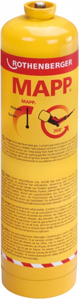 Газовый баллончик для горелки Rothenberger Mapp Gas (Ротенбергер Мапп Газ) – специальная газовая смесь для профессиональной пайки, температура пламени до 2700°C, на 35% эффективнее пропана.