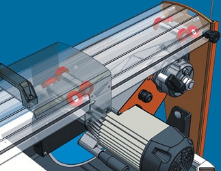 - Каретка электрического двигателя перемещается по направляющей рельсе на 8-ми шарикоподшипниках, 4-е из которых всегда находятся перпендикулярно направляющей рельсе, что обеспечивает быстрое и точное скольжение