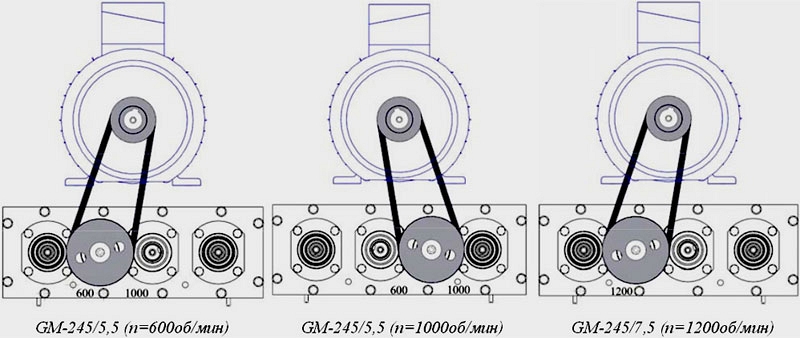 Имеется возможность изменения частоты вращения с 600 об/мин на 1000 об/мин и наоборот за счет перестановки шкива с одного вала на другой. Рядом с ведущими валами на корпусе редуктора выбито число, обозначающее частоту вращения траверс. Такое изменение частоты может потребоваться при проведении работ по полировке. - Возможность подключения пылесоса: