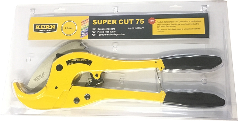 Ножницы для резки пластиковых труб Kern Super Cut 75 (Керн Супер Кат 75) с трещоткой предназначены для резки полипропиленовых (ПП, PP), полиэтиленовых (ПЭ, PE), полибутеновых (ПБ, PB), поливинилфторидовых (ПВДФ, PVDF), поливинилхлоридовых (ПВХ, PVC) труб Ø до 75 мм (3").