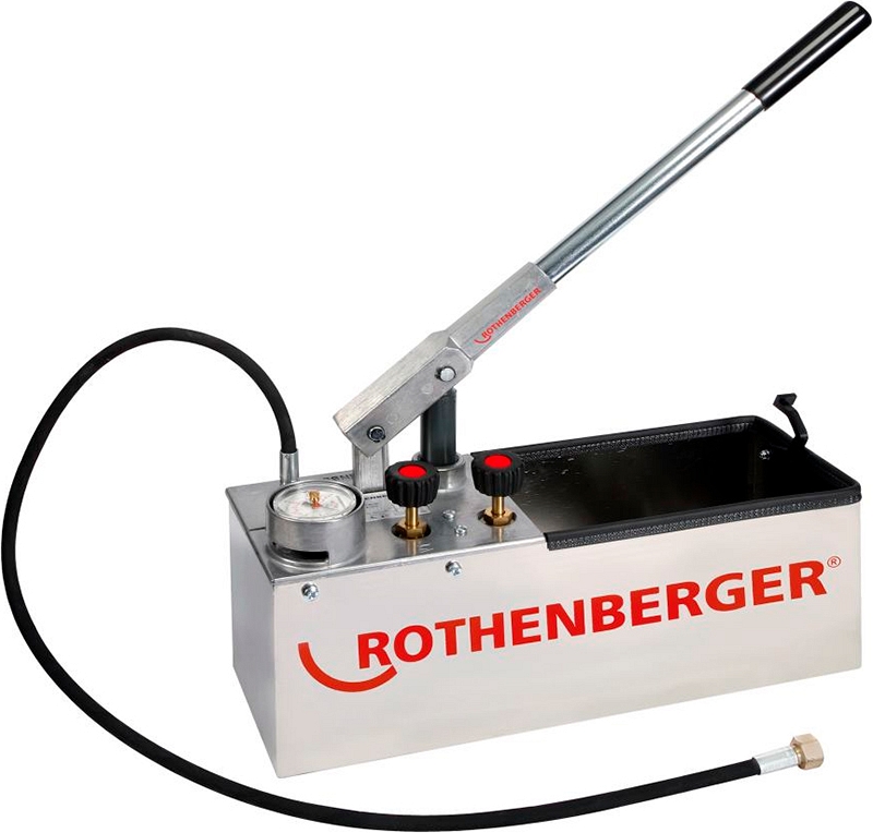 Опрессовочный насос Rothenberger RP 50-S Inox (Ротенбергер РП 50-С Инокс) – прочный, легкий и удобный ручной гидравлический опрессовщик предназначен для точного испытания давлением до 60 бар на герметичность с помощью воды или масла систем водоснабжения, отопления, канализации и резервуаров в жилых и промышленных помещениях, при изготовлении промышленных напорных резервуаров в котлостроении, а также при заполнении солнечных батарей.