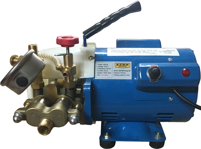 Опрессовщик электрический гидравлический Kern Super-Pump 60 (Керн Супер-Памп 60) – опрессовочный насос электрический для быстрой и точной проверки давлением до 60 бар герметичности резервуаров и трубопроводов в системах теплоснабжения, водоснабжения, канализации; в солнечных батареях; в системах сжатого воздуха; в системах, заполненных маслом; в холодильных установках; баллонов со сжатым газом; при производстве напорных резервуаров; при изготовлении бойлеров, в котлостроении; в разводке спринклеров.