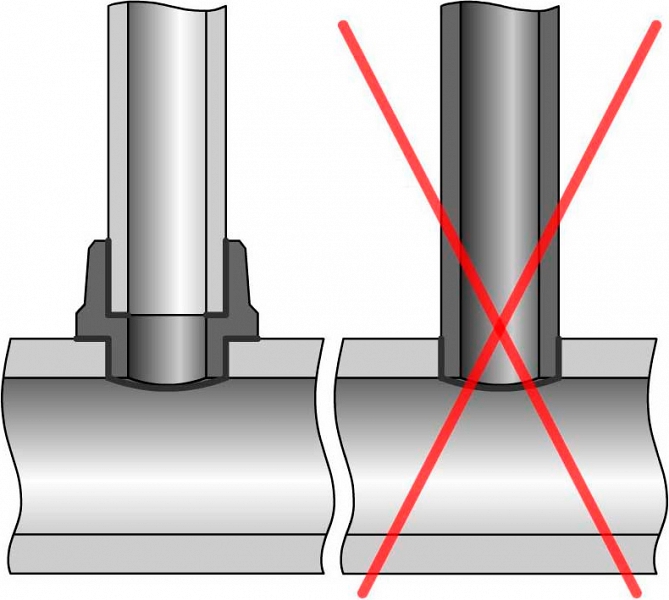 - У неопытного монтажника-любителя может возникнуть соблазн отказаться от седелки и ввариться в трубопровод непосредственно трубой меньшего диаметра, используя обычную насадку для раструбной сварки. Тут следует понимать, что в результате такой врезки получится неравнопроходной (редукционный) тройник, который по определению имеет неравномерное распределение напряжений в стенках. Если основной трубопровод и врезаемая труба имеют SDR 6 (обычная монолитная ПП труба для горячего водоснабжения), то длительная прочность такого сварного соединения в самом лучшем случае будет соответствовать SDR 7,4. Если при врезке важно сохранить расчетное рабочее давление трубопровода, использование седелки обязательно!