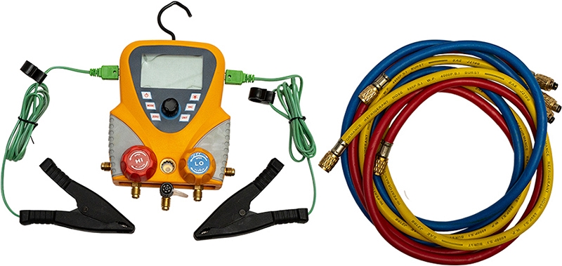 Цифровой манометрический коллектор со шлангами и клеммами в кейсе Voll V-MGC Digital (Волл В-МГЦ Диджитал) используется для измерения давления и температуры в системах кондиционирования, тепловых насосов и холодильного оборудования.
